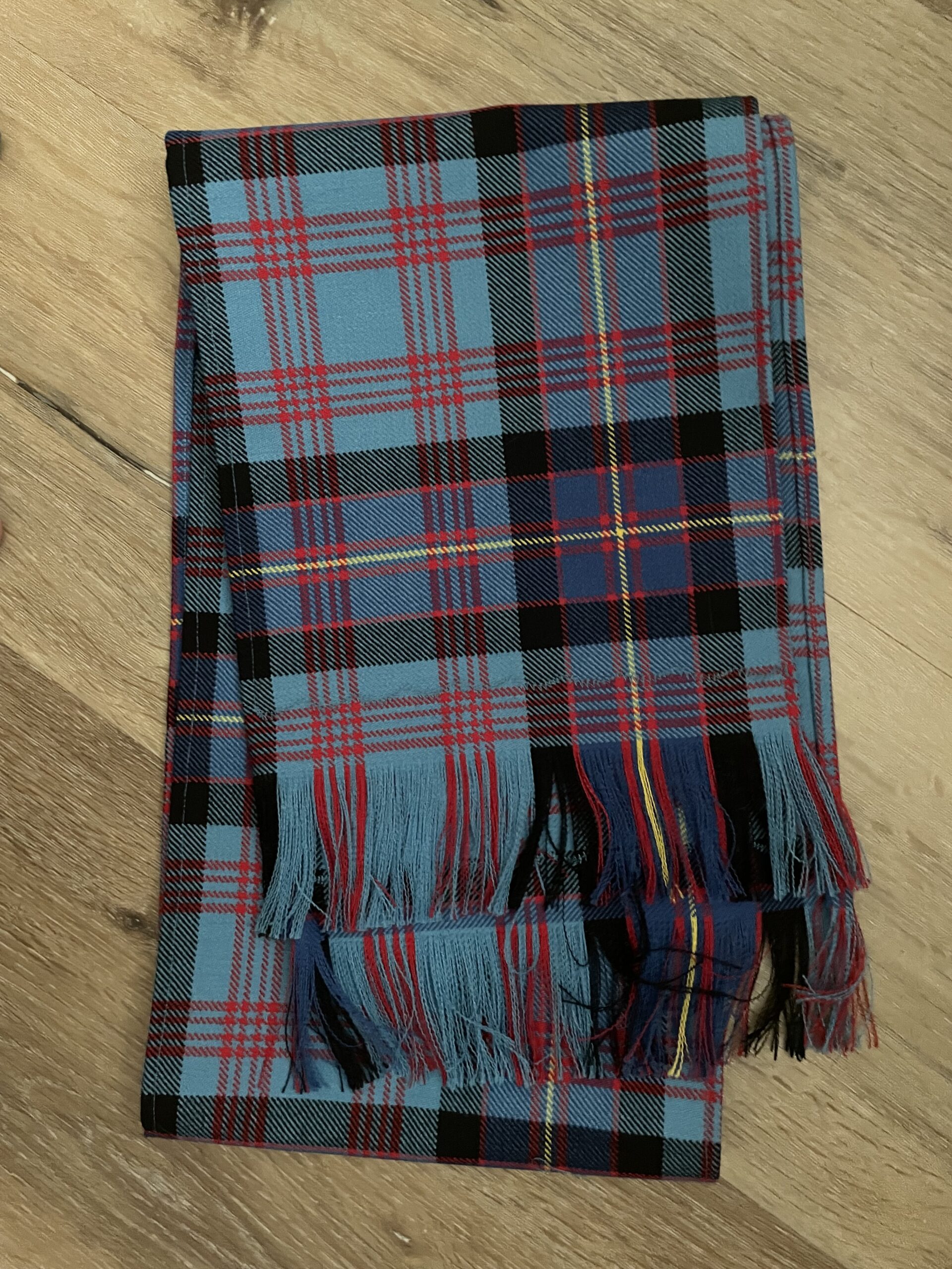 10 in. X 66 in. (Including fringe) Cochrane Azure scarf is made of 16 oz wool.  This scarf is a perfect match to Cochrane Azure kilts.  Shipping $10.00.